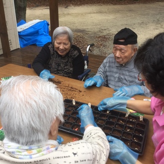 石田さんは、「石田さん、これ何をしているかわかりますか?」と、聞くと、「?????」と、頭を傾げてましたが、いざ種蒔きが始まると原田さんと一緒に種を蒔いてくれています。