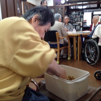 次に清水ハツエさんもぬかを容器に入れるをやってもらいました。清水さんは、「ハツエさん、手は容器以外触らんようにしてね。」と、お願いすると、ちゃんと、手を宙に浮かせたまま待ってくれていました。袋からぬかを出す際、上下を間違えてなかなか大変そうでしたが、最終的にきちんと入れてくださっています。ありがとうございます。