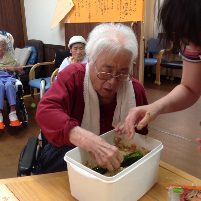今日は、急遽、作業回想法をみんなで楽しみました。出勤すると、キュウリがいっぱいあるから、ぬか漬けにできないかな?と、よしみさんと香さんから提案があり、やってみよう!と、いうことになりました。※確かに、袋に入った3本入りきゅうりが2袋開封されぬまま腐敗しておりました...(/_;)