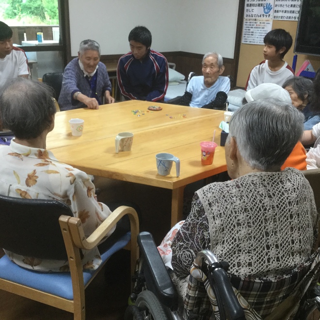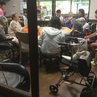 今日は、中学生が遊びにきてくれました。回想法、学習療法、いつものフロアの様子、廊下散歩など、各スペースで同時進行に体験してもらいました。なので、回想法は、山広間で二回しました。初めは、予定通り散髪の想い出、次に、昔の遊びについて回想しました。