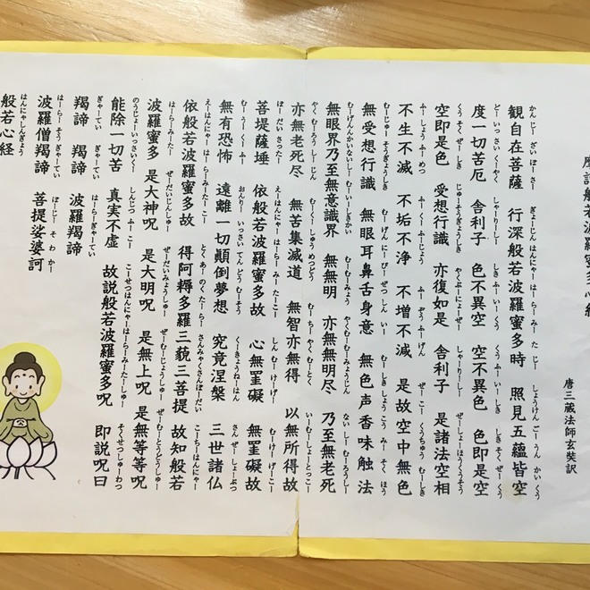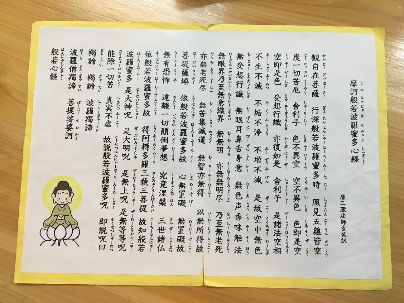 ふくふくの会では 回想法の一つとして 毎日 般若心経を唱えています。驚くことに 100歳になろうかという利用者さんも 目を閉じて スラスラと唱えるているのです。生活の一部だったんですね。私も アンチョコを見ながら なんとか ついていっていますが、不思議なことに なんだか心が落ち着いてくるんです。